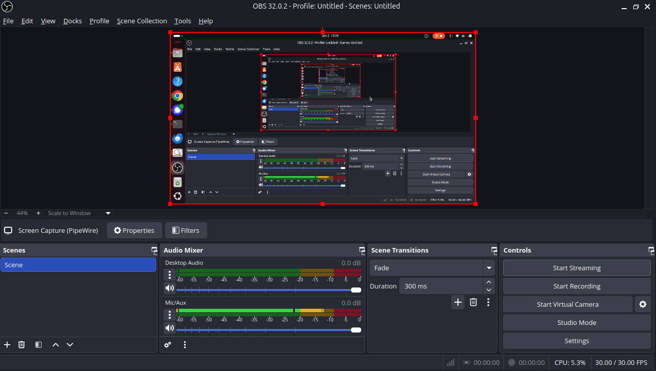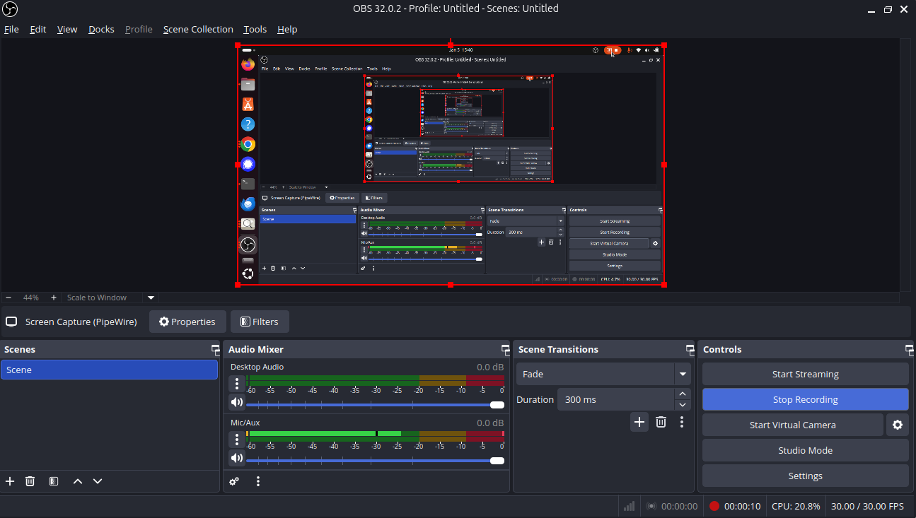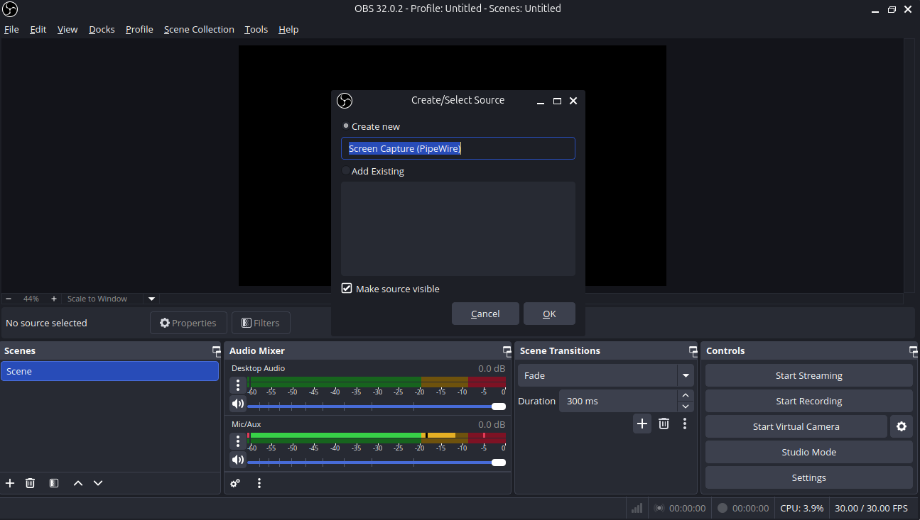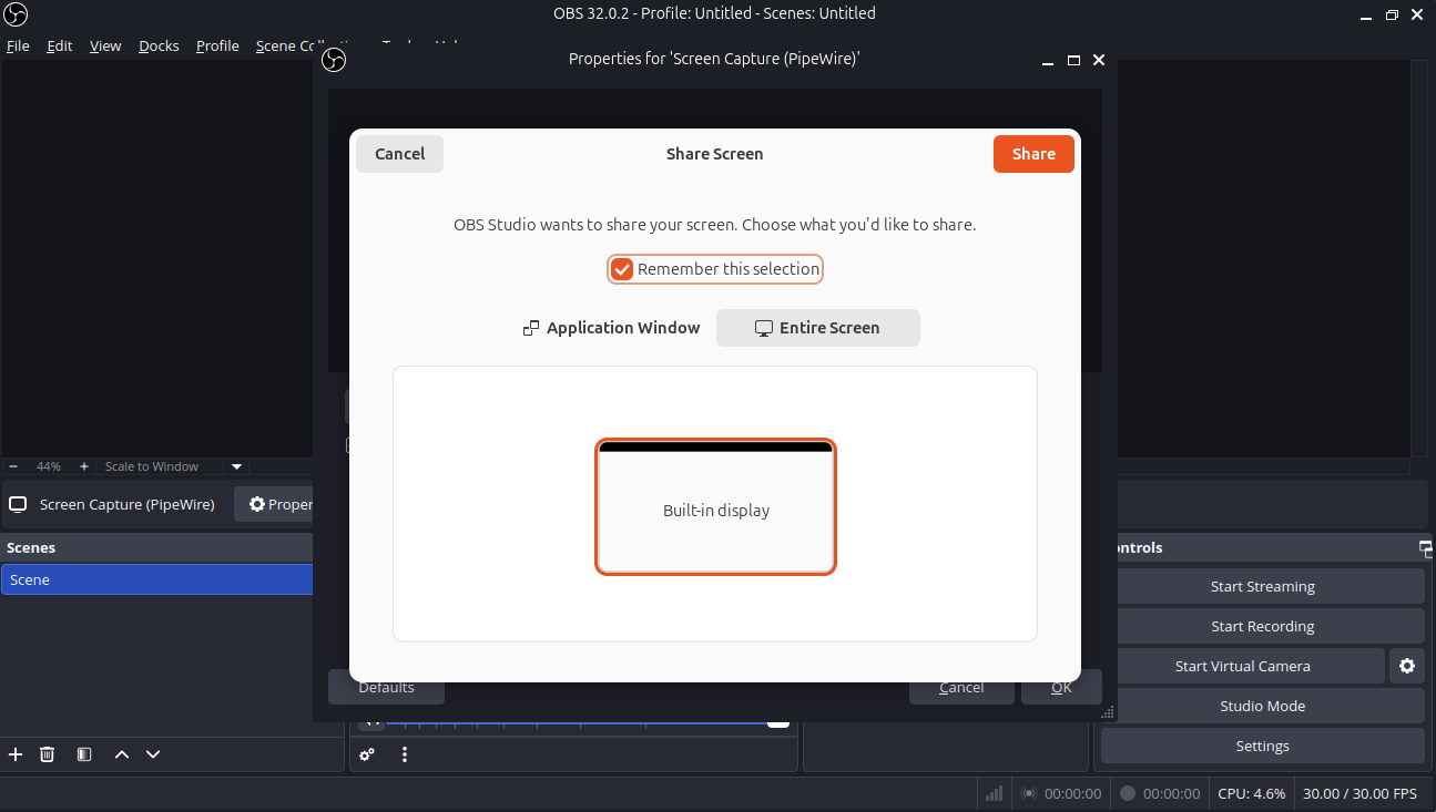 Before Screen recording add source and click screen capture(pipewire).