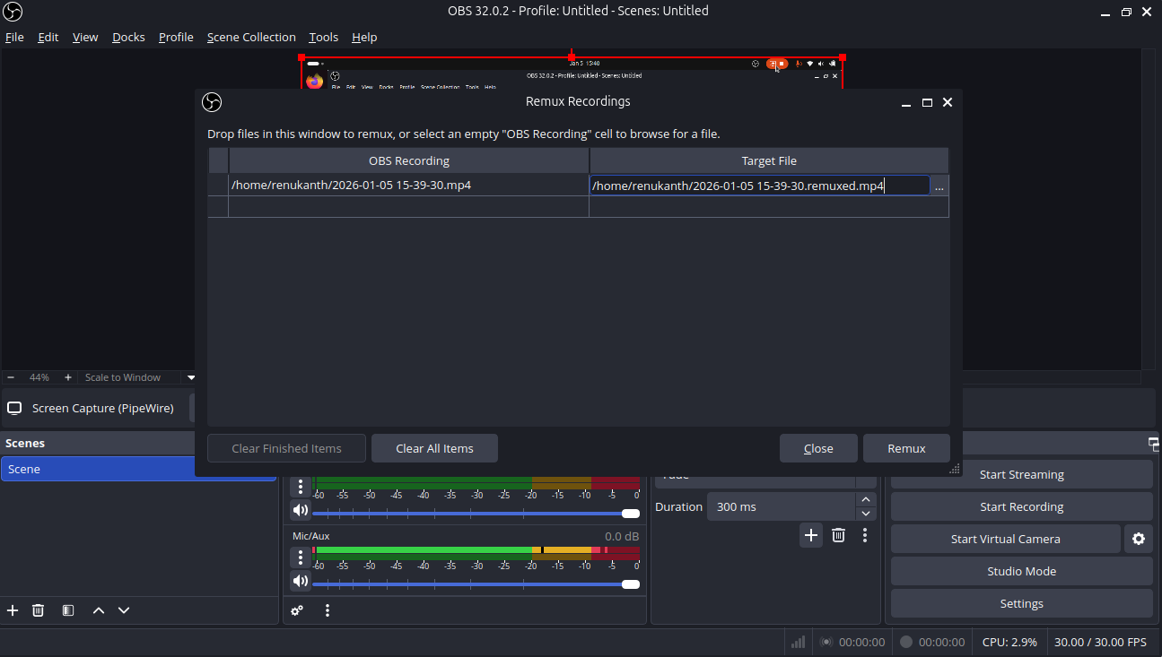 - Select obs recording file and click remux button and converted into MP4 file.